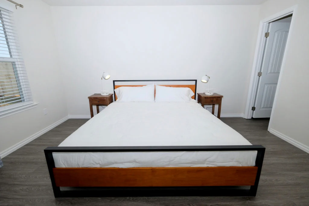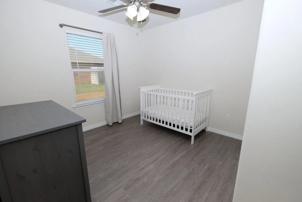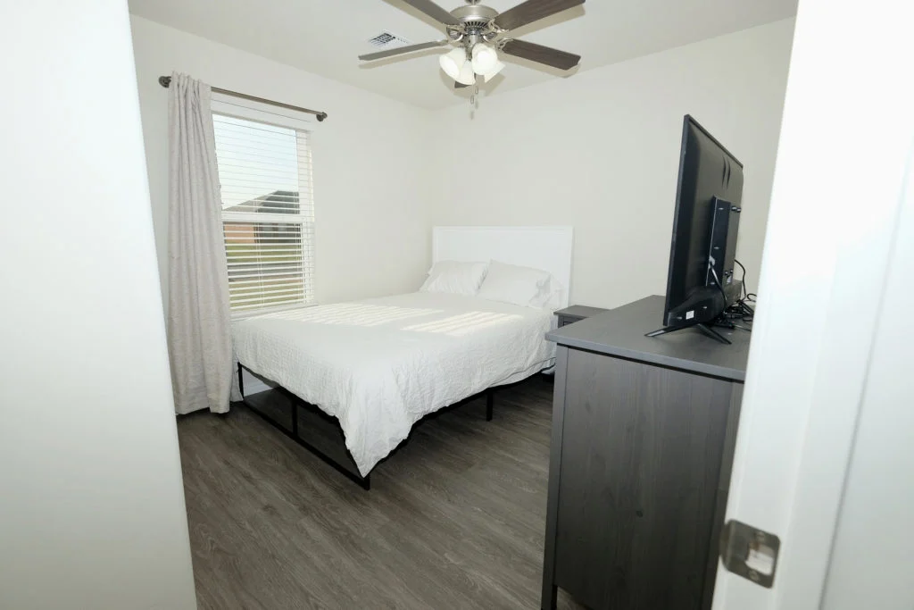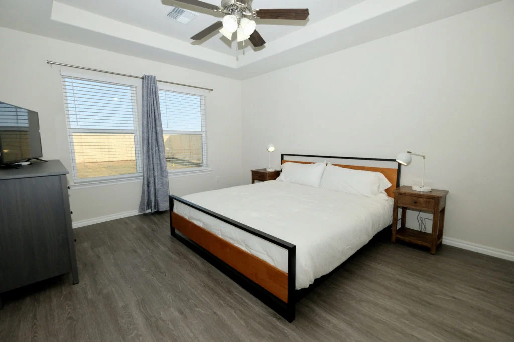The master bedroom has a King size bed with a walk in closet and 43” TV. The 2nd bedroom has a Queen size bed with 43” TV. The 3rd bedroom has a crib.