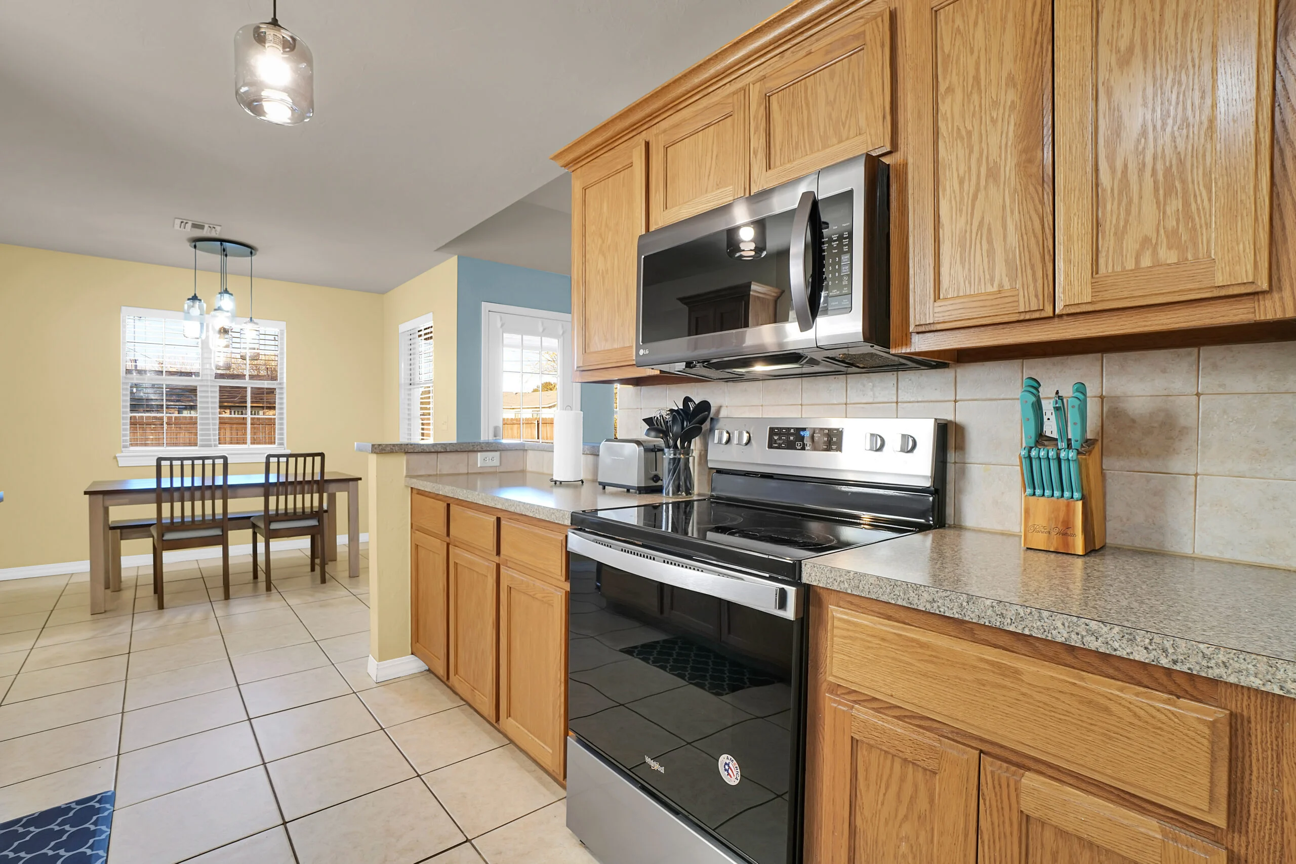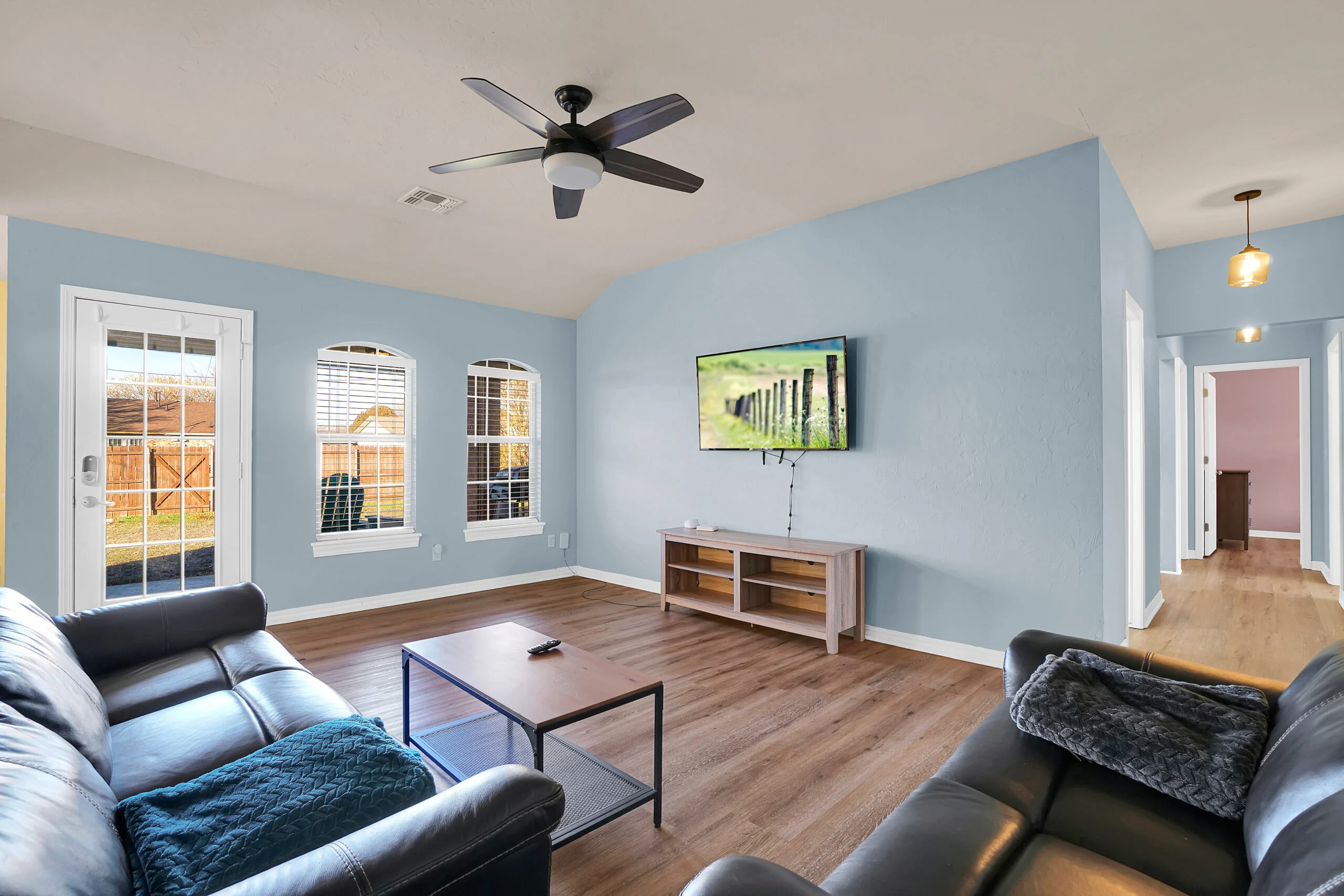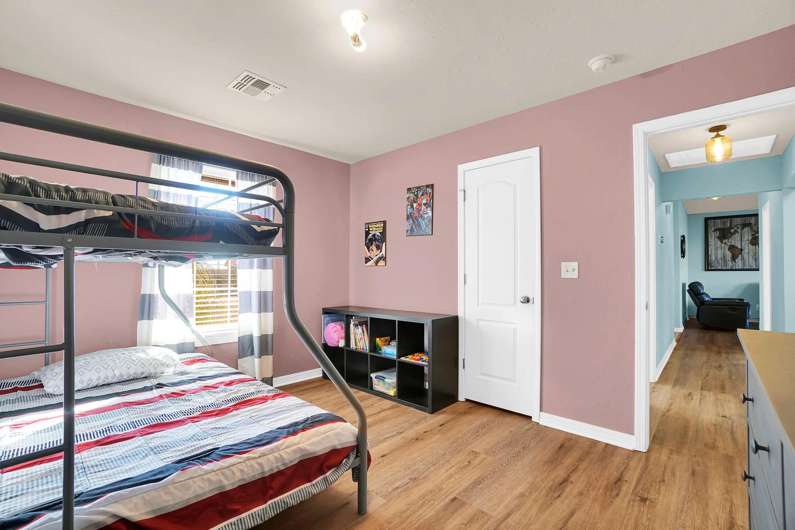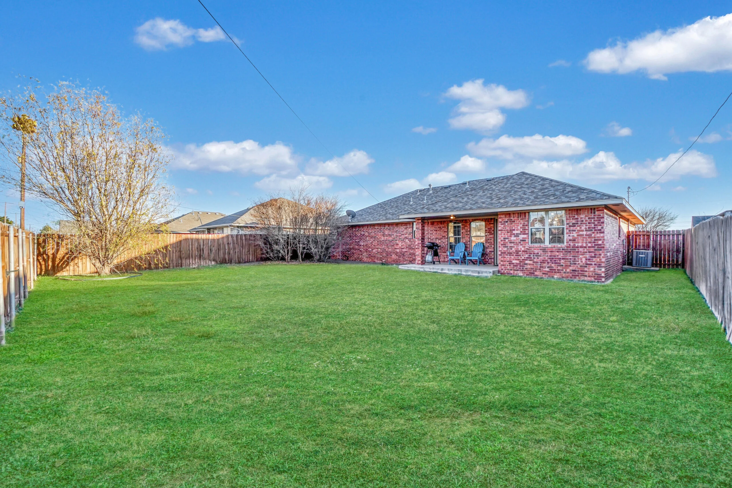 Family Ready! This 3-bedroom, 2-bath home features a fully stocked kitchen. The master bedroom includes a queen bed, the second bedroom has a twin-over-full bunk bed, and the third bedroom is equipped with a crib. The property boasts a large lawn, a back patio, in-house laundry, and a spacious living room for your comfort and convenience.