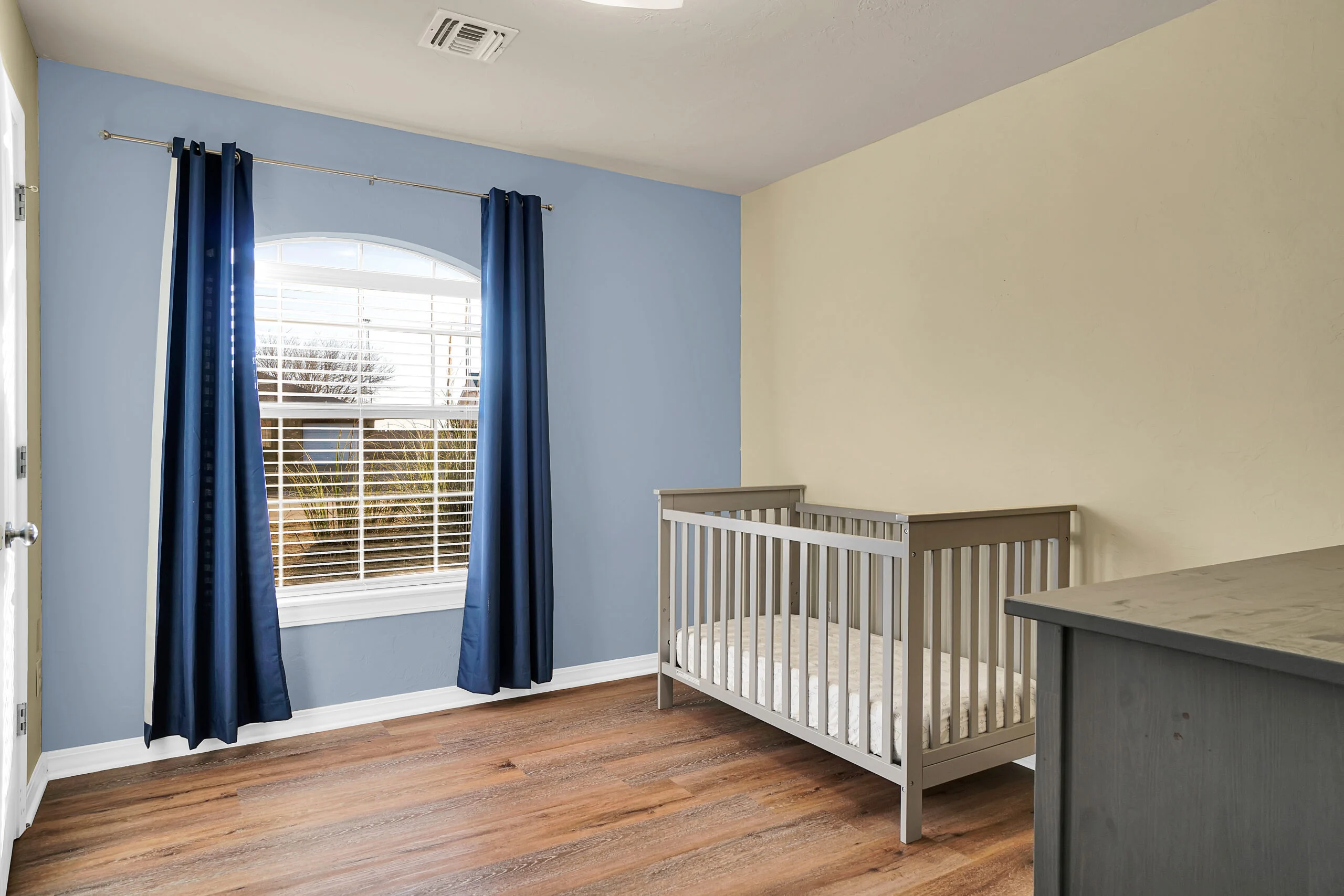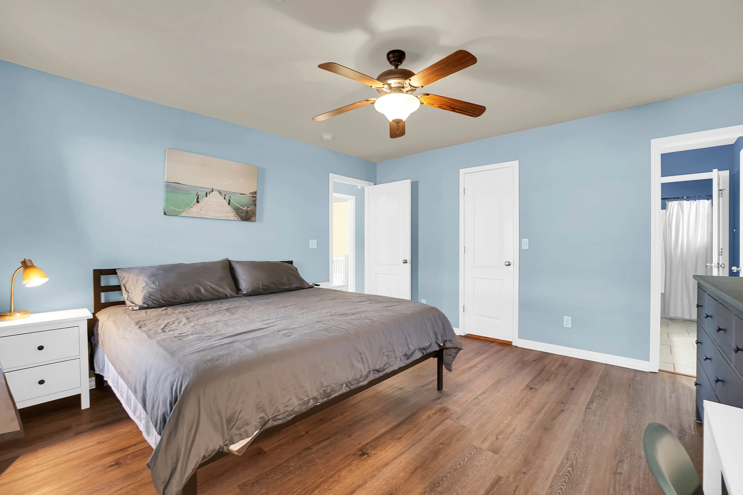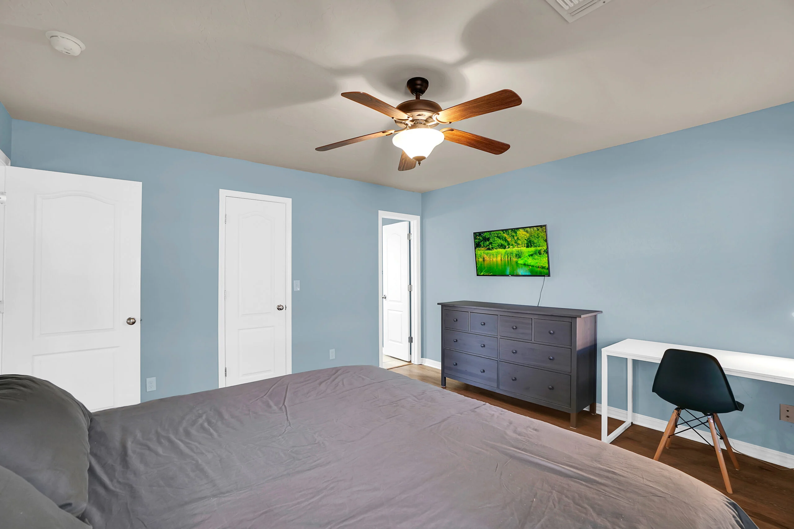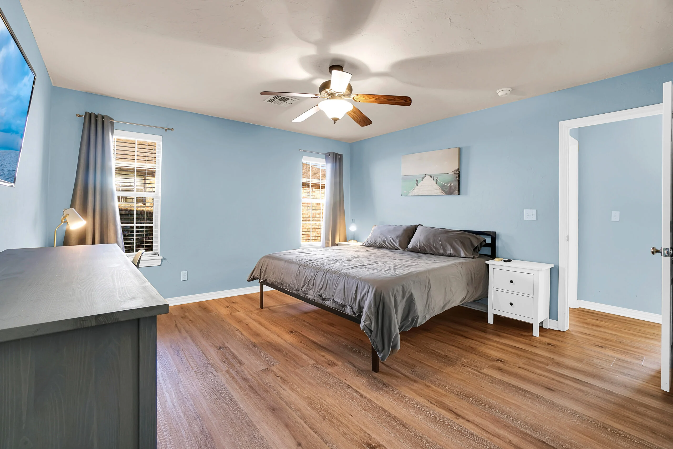 Family Ready! This 3-bedroom, 2-bath home features a fully stocked kitchen. The master bedroom includes a queen bed, the second bedroom has a twin-over-full bunk bed, and the third bedroom is equipped with a crib. The property boasts a large lawn, a back patio, in-house laundry, and a spacious living room for your comfort and convenience.
